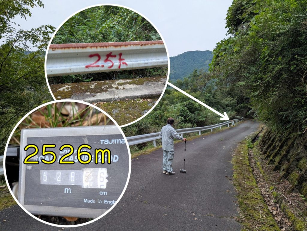ガードレールにスプレーで2.5キロ地点の印が付けられているのですが、実測地点(男性が立っている場所)から26メートル先にありました。